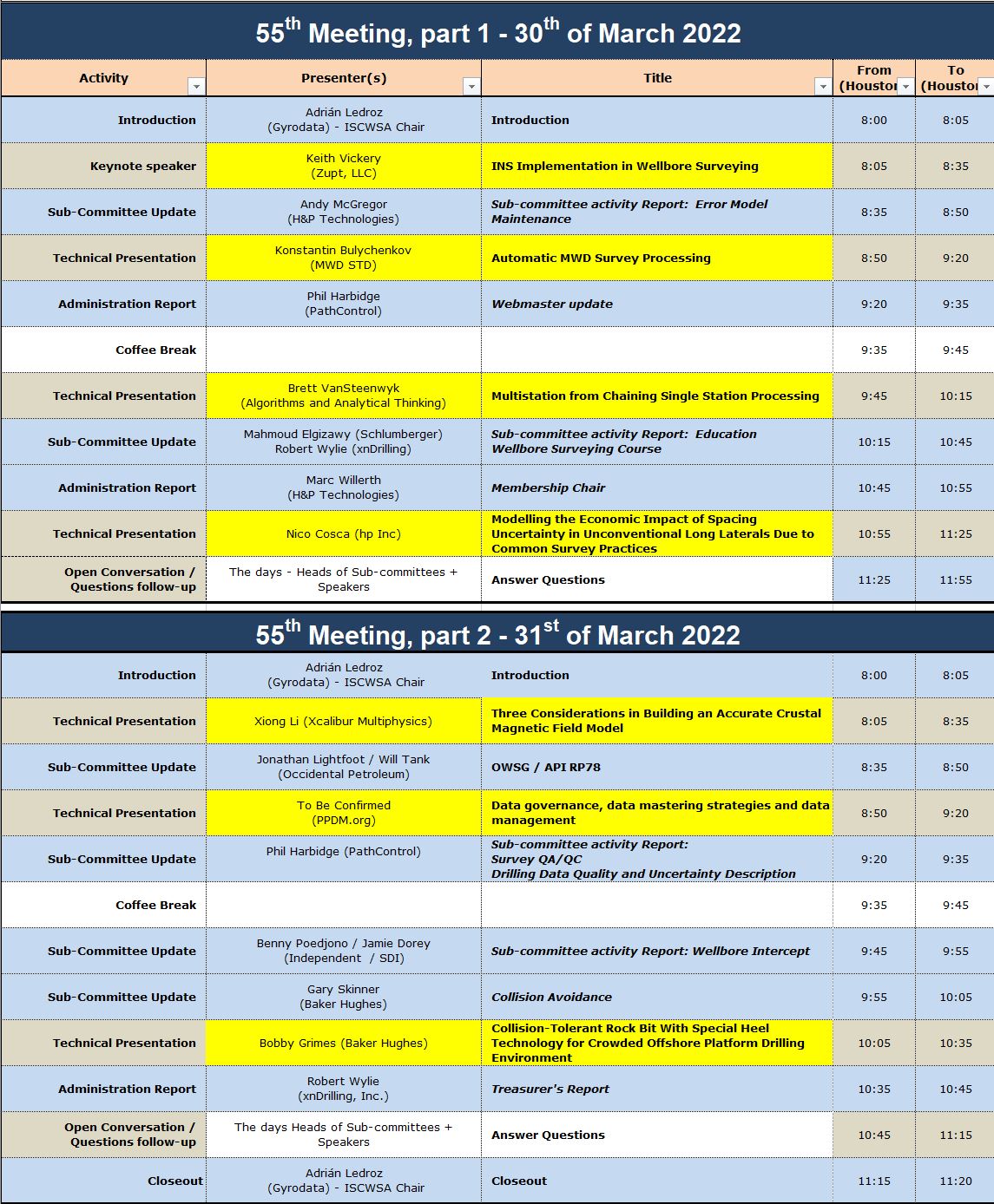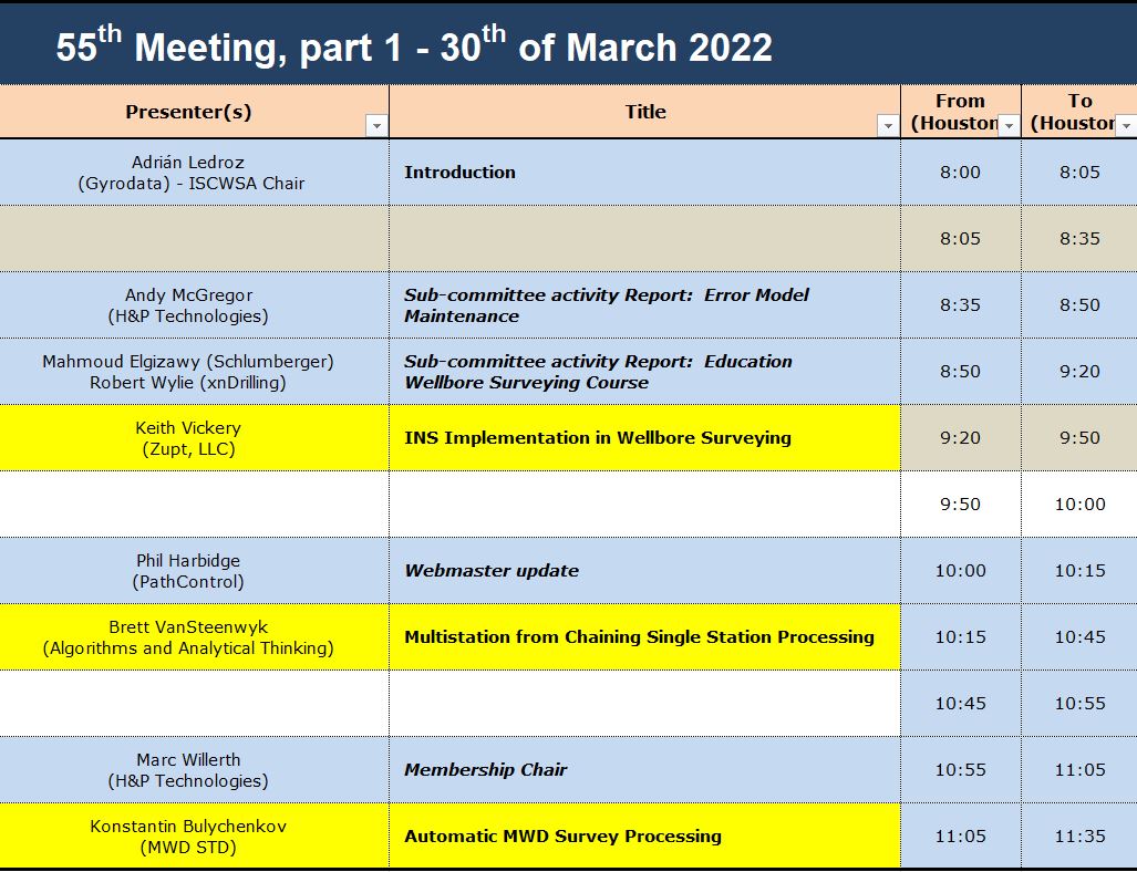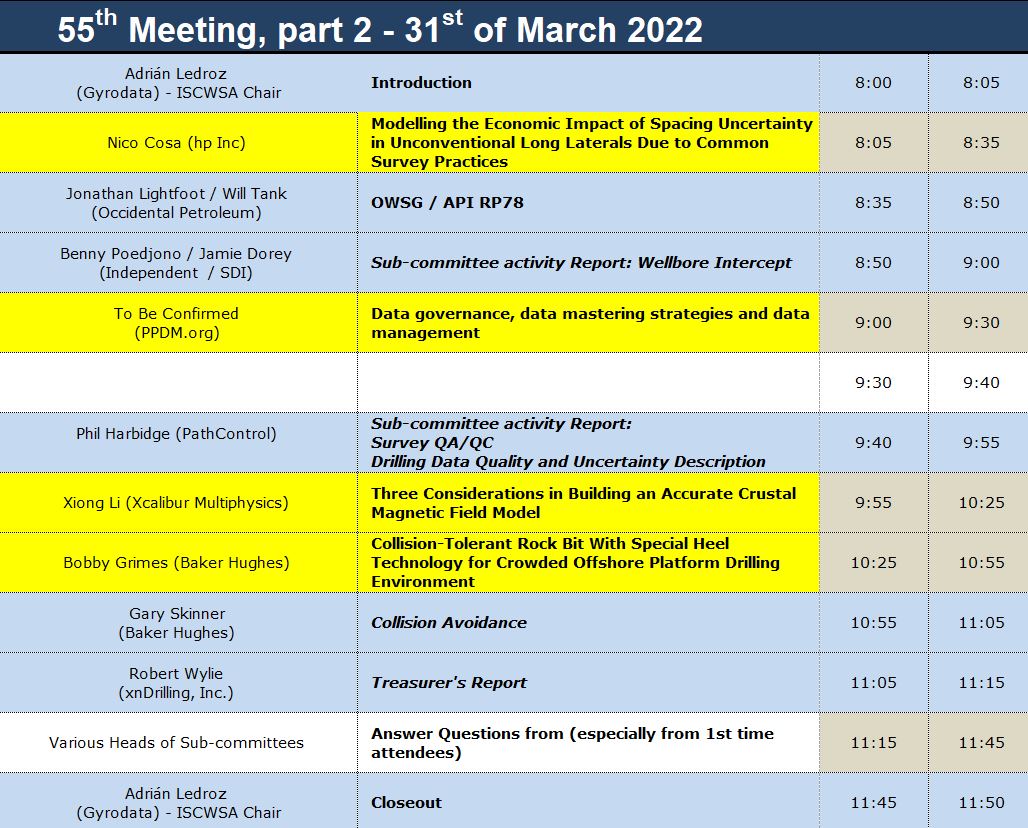 The 55th ISCWSA General Committee Meeting was held as a Virtual event on March 30th and 31st 2022, from 8am to noon (Central Daylight Time, UTC - 5).
