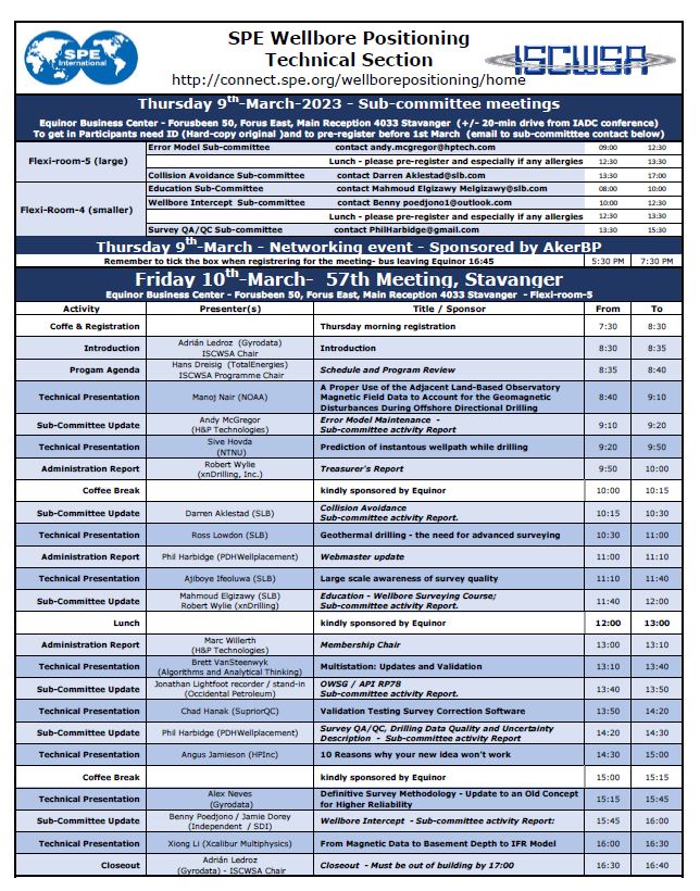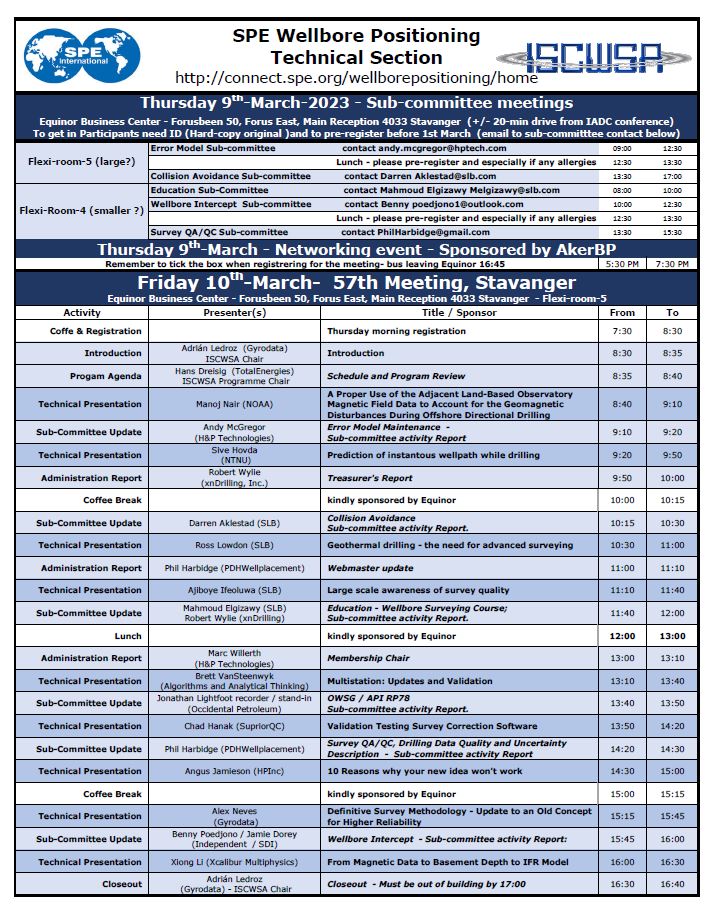The 57th General Meeting of the ISCWSA was held in conjunction with the SPE/IADC Drilling Conference in March 2023, in Stavanger, Norway, hosted by Equinor at the Equinor Business Center in Forus.